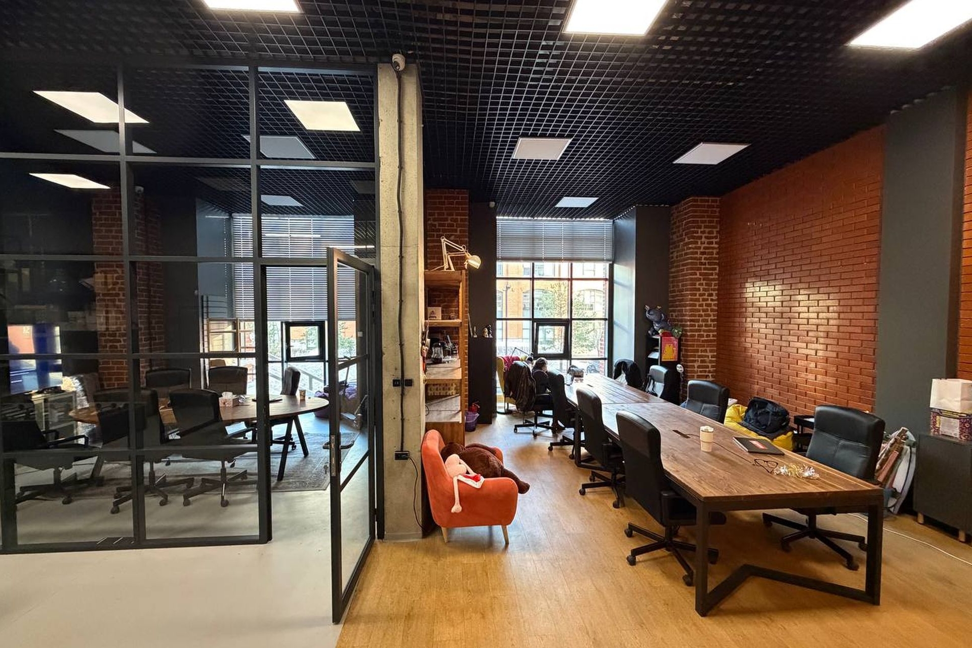 Просторное помещение с окнами, переговорками и мебелью.